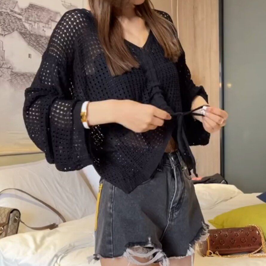 2021夏季韩版时尚抽绳设计感显瘦镂空冰丝针织衫防晒衫V领上衣女热门设计联盟服务商